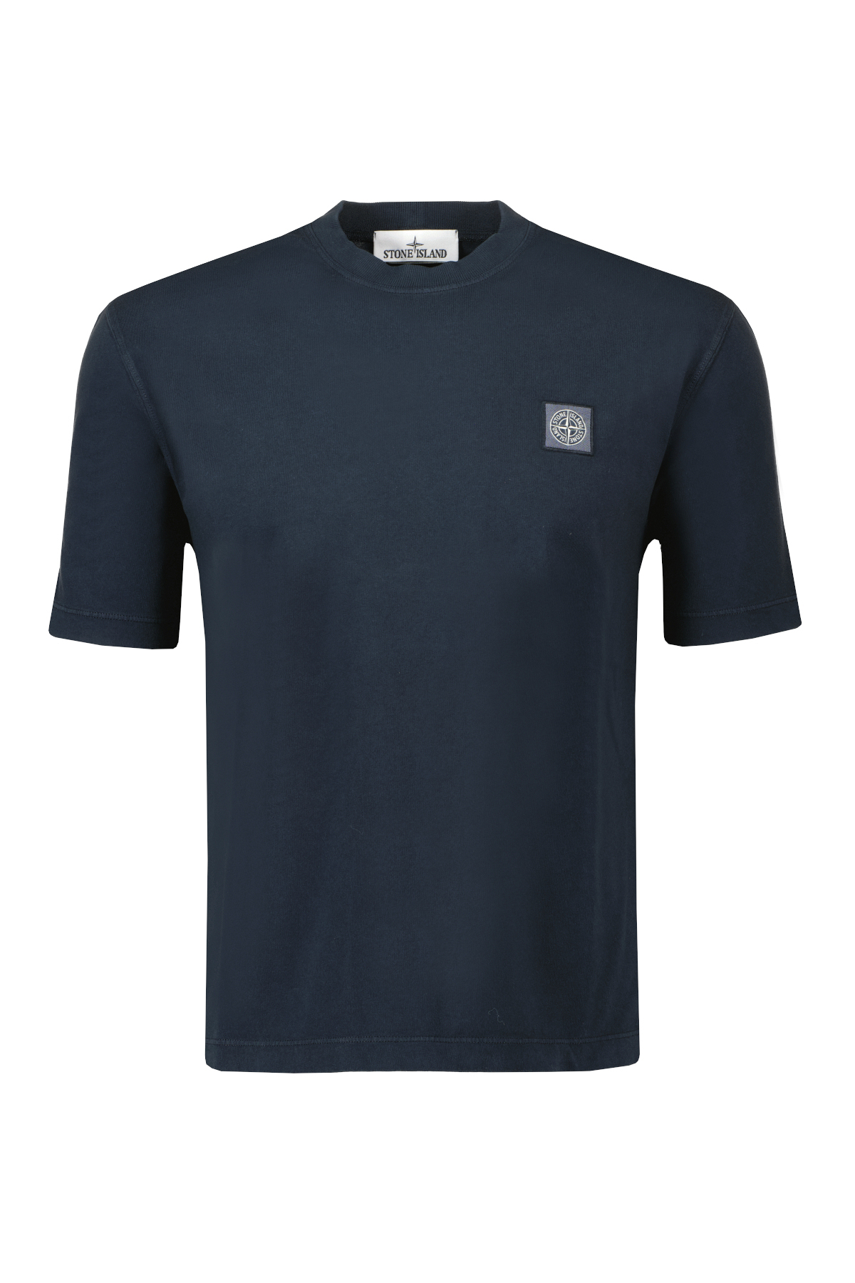 Donkerblauw T-shirt voor heren van Stone Island. Dit T-shirt met korte mouwen is gemaakt van biologisch katoenen jersey, garment dyed en behandeld met het 'FISSATO'-effect, een behandeling met wateroplosbare hars en een verftechniek voor kleding die een driedimensionaal effect creëert.