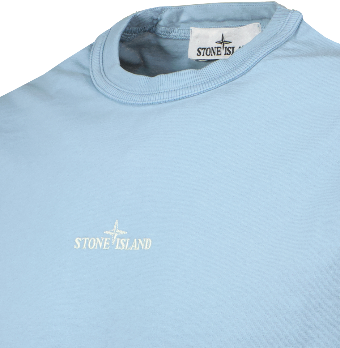 Lichtblauw T-shirt voor heren van Stone Island. Dit T-shirt met korte mouwen is gemaakt van biologisch katoenen jersey, garment dyed en behandeld met het 'FISSATO'-effect, een behandeling met wateroplosbare hars en een verftechniek voor kleding die een driedimensionaal effect creëert.