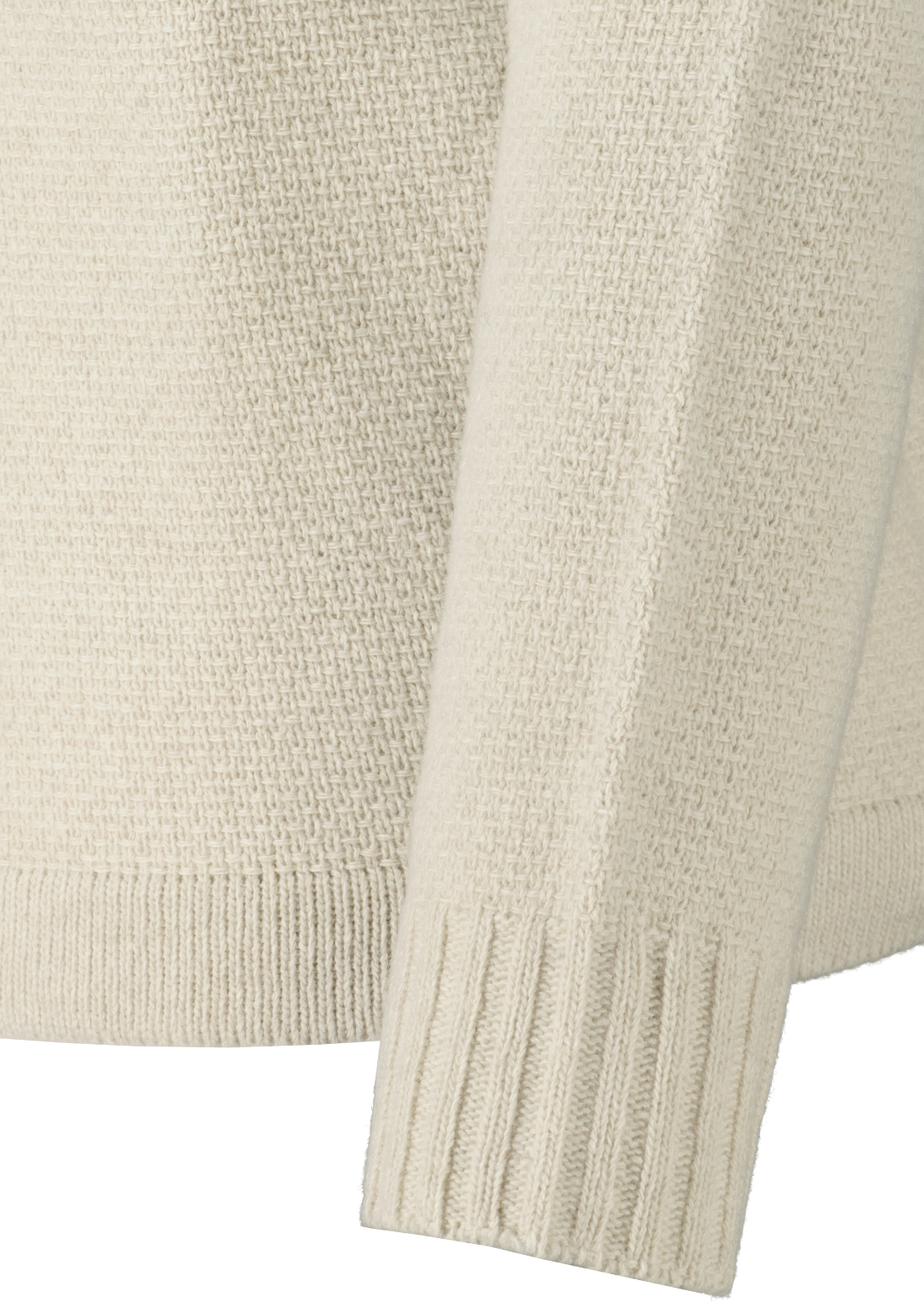 Gebroken witte gebreide trui van Stone Island. De trui heeft een geribbelde kraag met kleine rolafwerking, een Stone Island-badge op de linkermouw, platte geribde manchetten, geribde onderband en een normale pasvorm.