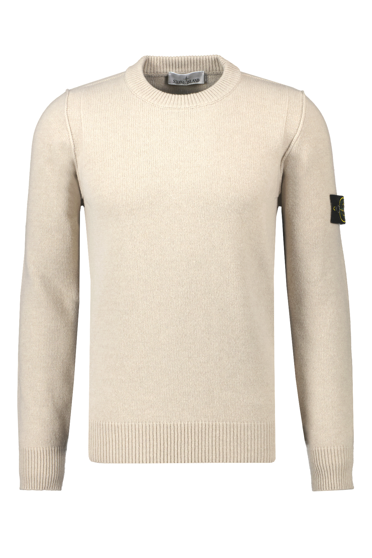 Lichtbeige trui voor heren van Stone Island. De trui heeft een geribbelde halslijn, een averechte tricotsteekband bij de schouders en de armsgaten, verhoogde naden bij de armsgaten, het Stone Island-badge op de linkermouw, geribbelde manchetten en onderband en een normale pasvorm.