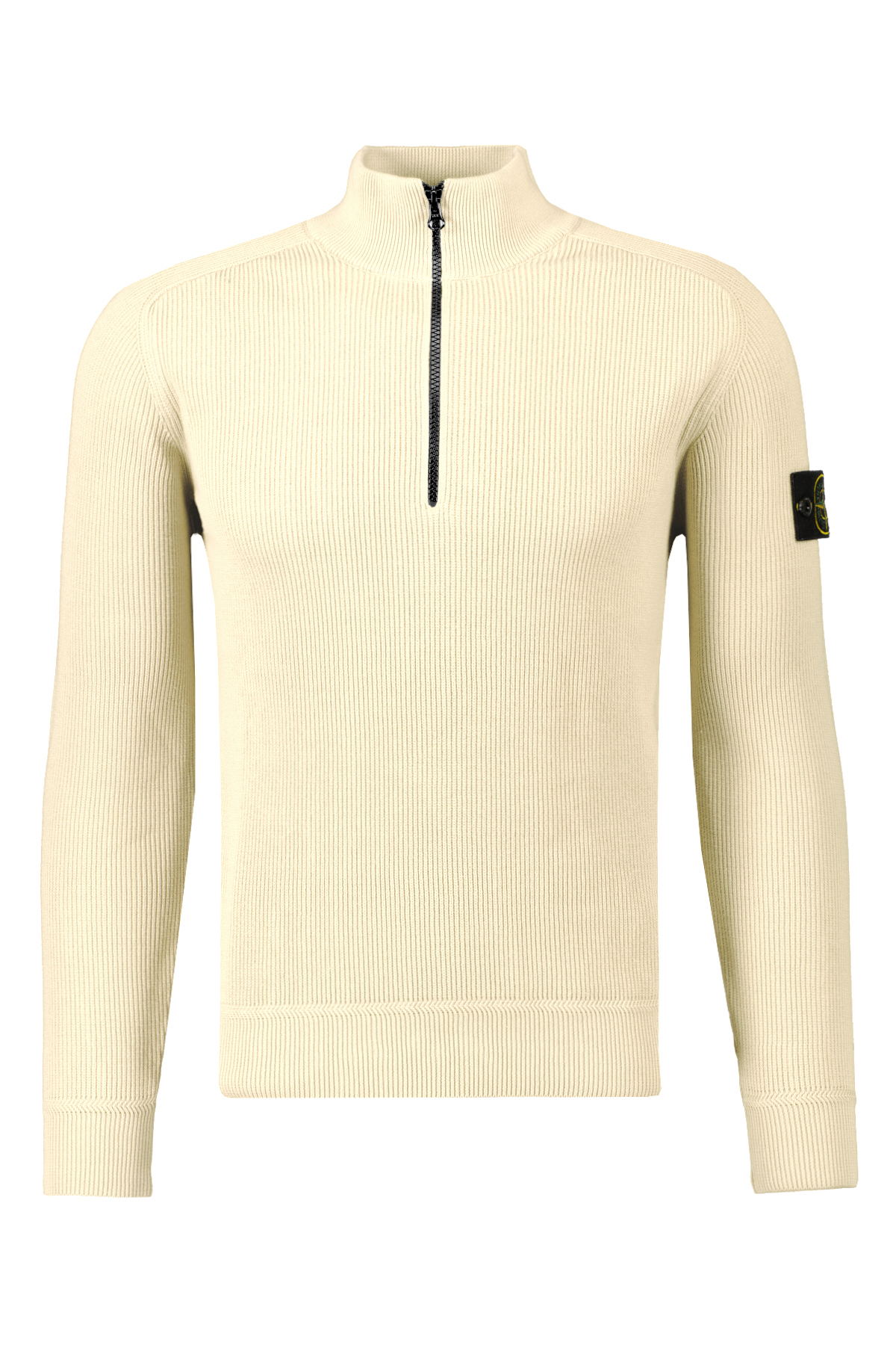 Beige half-zip trui in verticaal gestreept motief voor heren van Stone Island. De trui is gemaakt van zacht biologisch katoen met volledige ribbelsteek, heeft een opstaande kraag en manchetten met ritssluiting en een onderband met een steekmotief. Heeft een Stone Island badge op de linkermouw en een normale pasvorm.