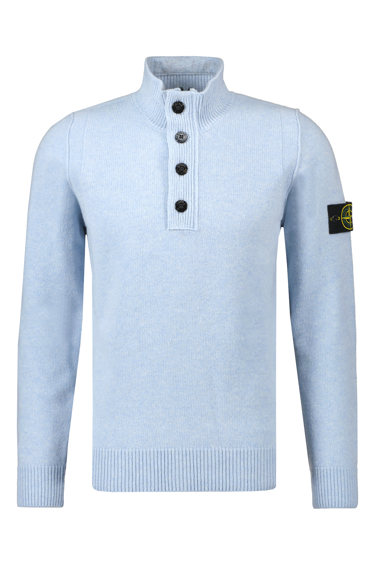 Lichtblauwe trui voor heren van Stone Island. Deze trui heeft een geribbelde opstaande kraag met vilten rand aan de binnenkant en ritssluiting onder de met vilt gevoerde knoopsluiting. Heeft een averechts gestikte band op de schouders en langs de armsgaten, een Stone Island-badge op de linkermouw, geribbelde manchetten en onderboord en heeft een normale pasvorm.