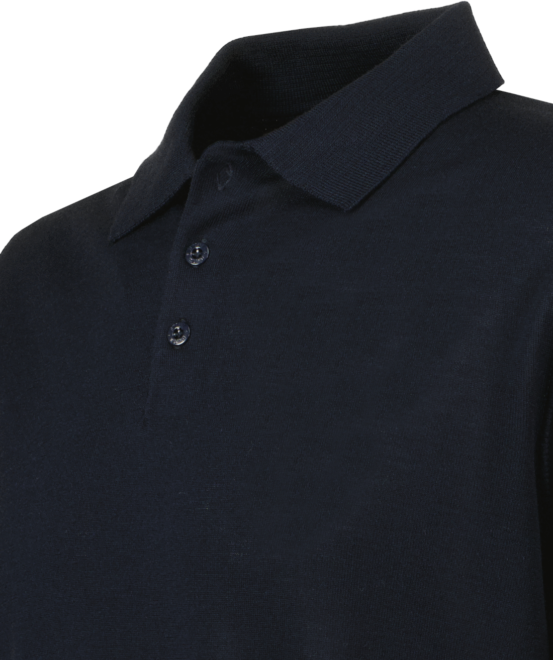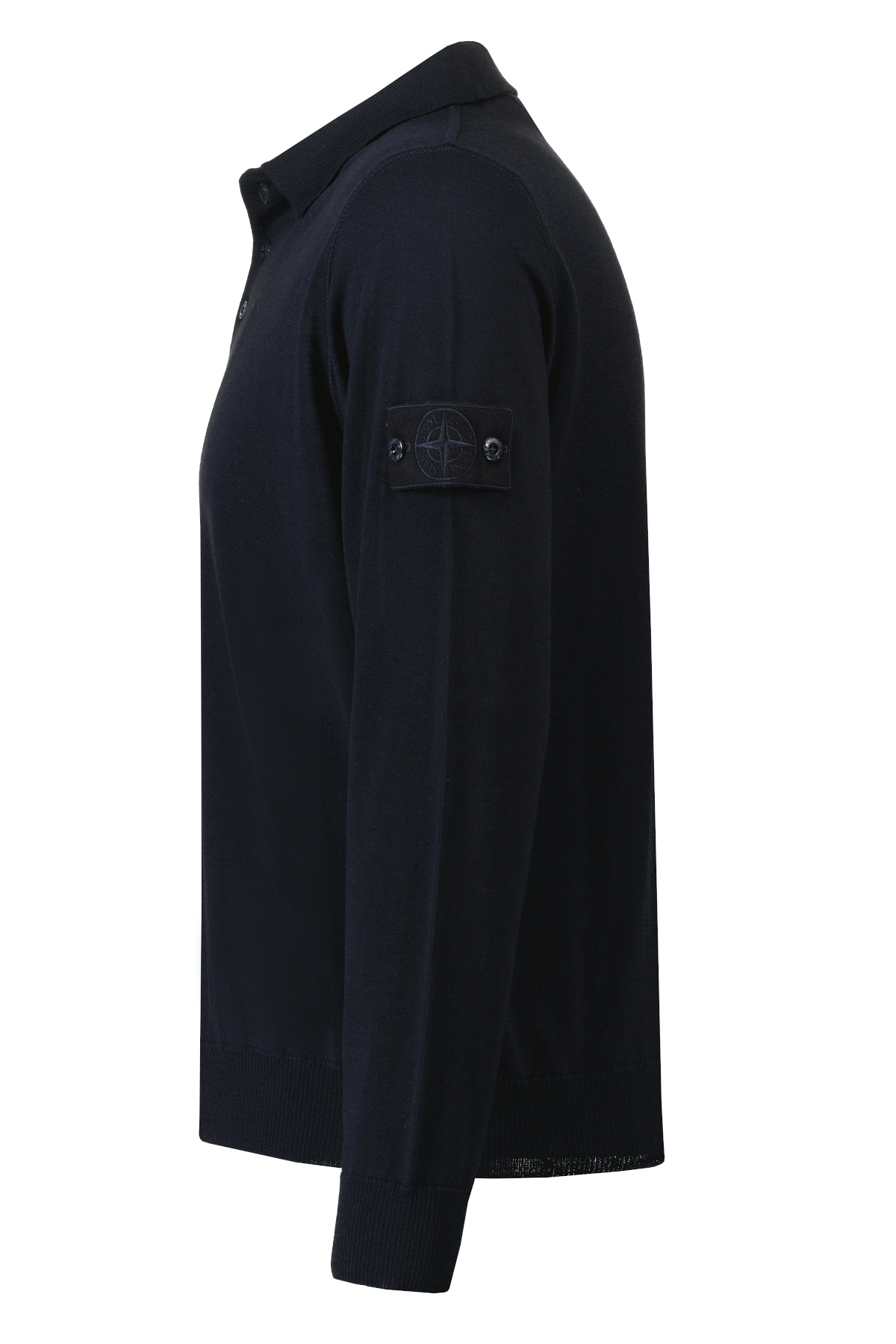 Donkerblauwe trui uit de Ghost Collectie voor heren van Stone Island. De trui heeft een dun geribde kraag met drieknoopssluiting, cverlocknaden op de schouders en armsgaten, een Stone Island Ghost-badge op de linkermouw, een geribde manchetten en onderband en heeft een normale pasvorm.