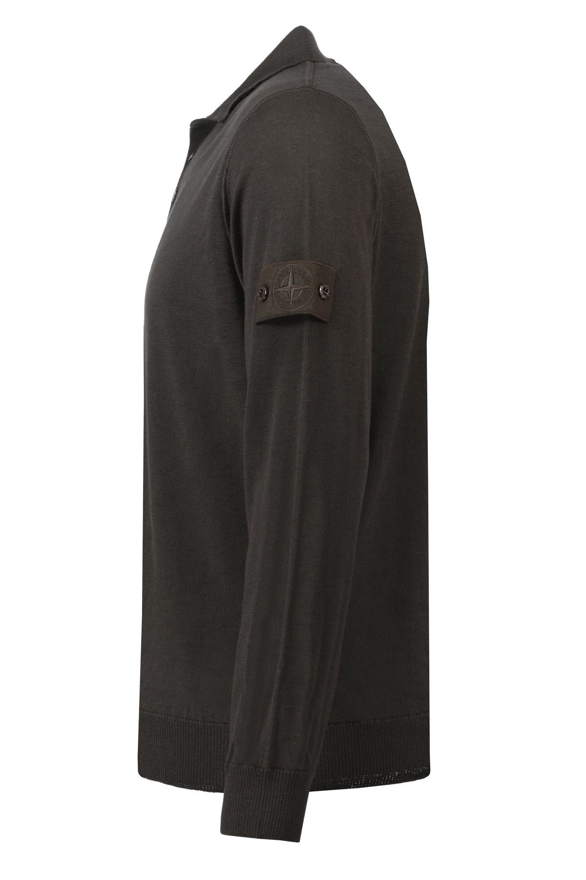 Donkerbruine trui uit de Ghost Collectie voor heren van Stone Island. De trui heeft een dun geribde kraag met drieknoopssluiting, cverlocknaden op de schouders en armsgaten, een Stone Island Ghost-badge op de linkermouw, een geribde manchetten en onderband en heeft een normale pasvorm.