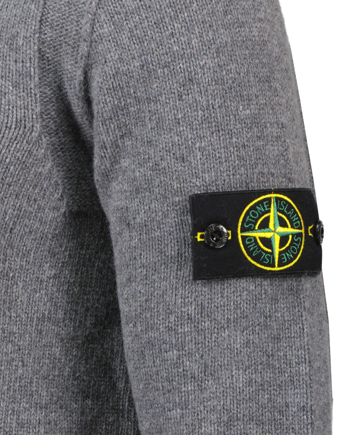 Grijs, gebreid vest van Stone Island. Dit vest heeft een opstaande vilten kraag met geribde steek aan de binnenkant en geribde gebreide kinband met knoopsluiting. Verder heeft het vest een bandmotief in omgekeerde tricotsteek op de schouders en het armsgat aan de voorkant, opstaande naden bij de armsgaten. Een Stone Island-badge op de linkermouw, geribde manchetten en onderband, een verborgen dubbele ritssluiting onder de knoopsluiting en heeft een normale pasvorm.