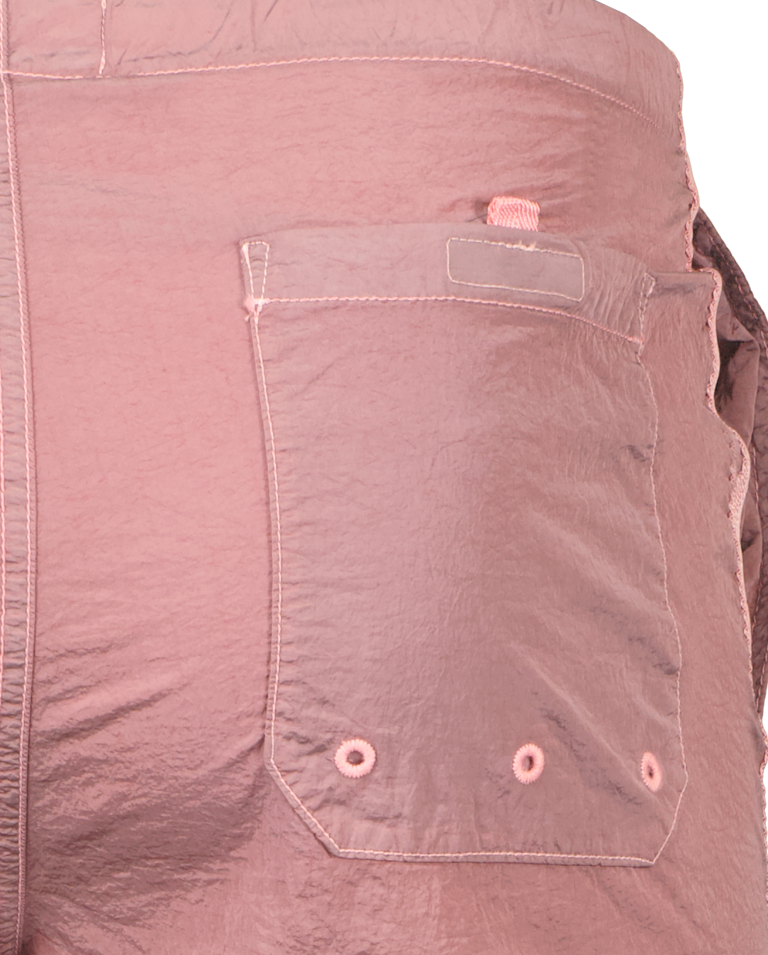 Deze roze Nylon Metal Zwemshort van Stone Island is door een uitgebreide verfprocedure gegaan, waardoor de vezels en details van de zwembroek verschillende tinten en kleuren krijgen.
