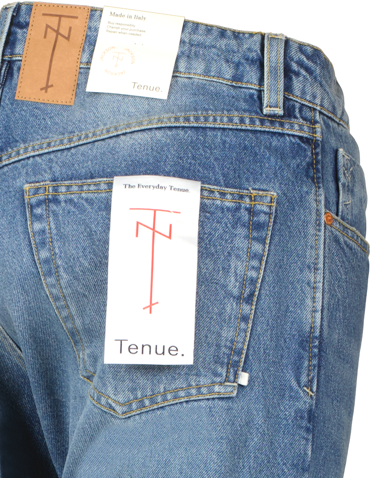 Blauwe jeans voor heren model Jackson van Tenue. De Tenue. Jackson jeans hebben een relaxte bovenbouw en een hoge taille, gecombineerd met een mooi getailleerde pijp. Dit betekent dat de pijp van de Jackson naar de voet toe smaller wordt. De jeans zijn gemaakt van 100% biologisch katoenen denimstof. De vintage 'Klamath'-wassing is verwassen tot een donkerdere indigo, met natuurlijke scraping en gemaakt van 100% organisch katoen. Jackson wordt gemaakt in Italië.