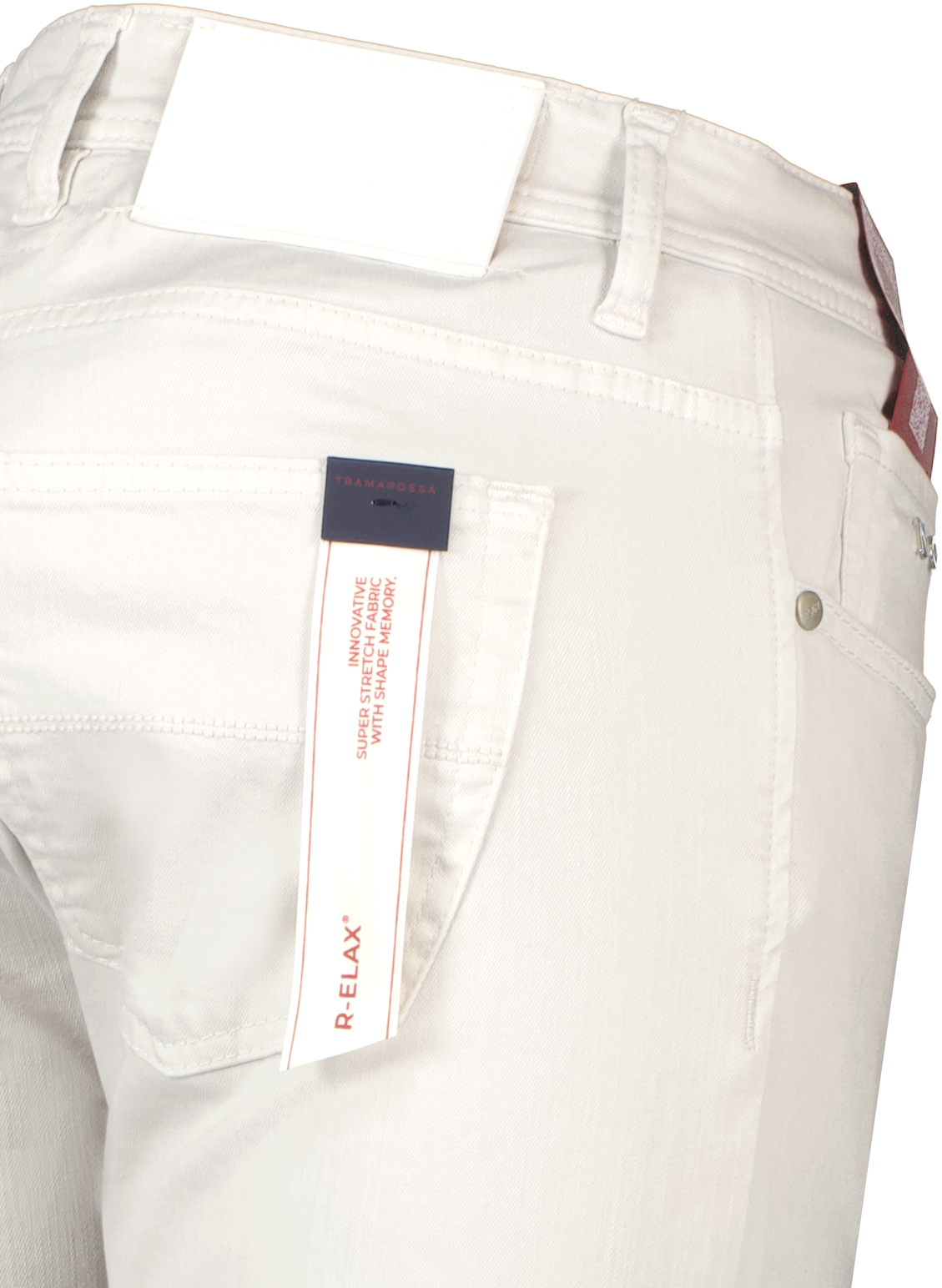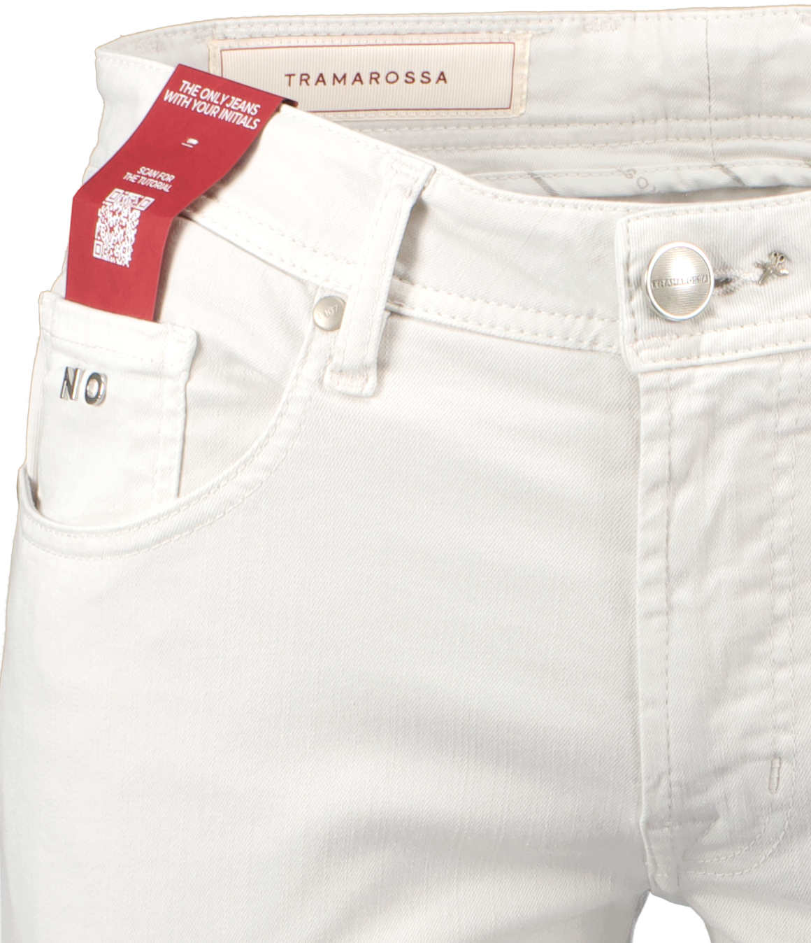 Lichtbeige heren jeans van Tramarossa in model Leonardo. De Leonardo valt slim met lichte stretch, en minimaliseert de structuur van de stof de vorming van kreukels. De wassing heeft een 6 months heritage. Verder heeft de jeans een 5 pocket afwerking met ritssluiting. De jeans kunnen worden voorzien van je initialen d.m.v. kleine, metalen letters. Vraag hiernaar in onze winkels.
