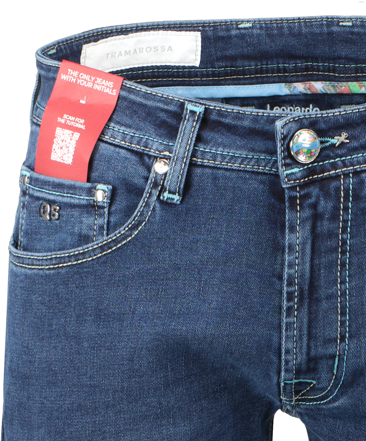 Donkerblauwe heren jeans van Tramarossa in model Leonardo. De Leonardo valt slim met lichte stretch, en minimaliseert de structuur van de stof de vorming van kreukels. De wassing heeft een 6 months heritage. Verder heeft de jeans een 5 pocket afwerking met ritssluiting. De jeans kunnen worden voorzien van je initialen d.m.v. kleine, metalen letters. Vraag hiernaar in onze winkels.