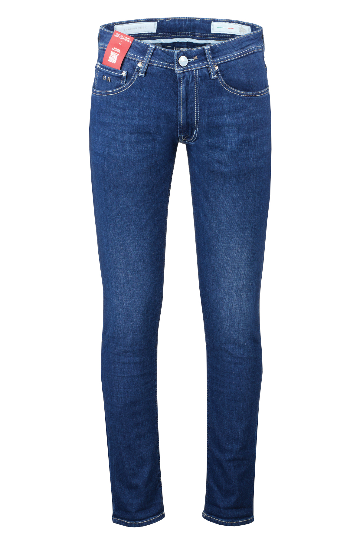 Blauwe heren jeans van Tramarossa in model Leonardo. De Leonardo valt slim met lichte stretch, en minimaliseert de structuur van de stof de vorming van kreukels. De wassing heeft een 6 months heritage. Verder heeft de jeans een 5 pocket afwerking met ritssluiting. De jeans kunnen worden voorzien van je initialen d.m.v. kleine, metalen letters. Vraag hiernaar in onze winkels.