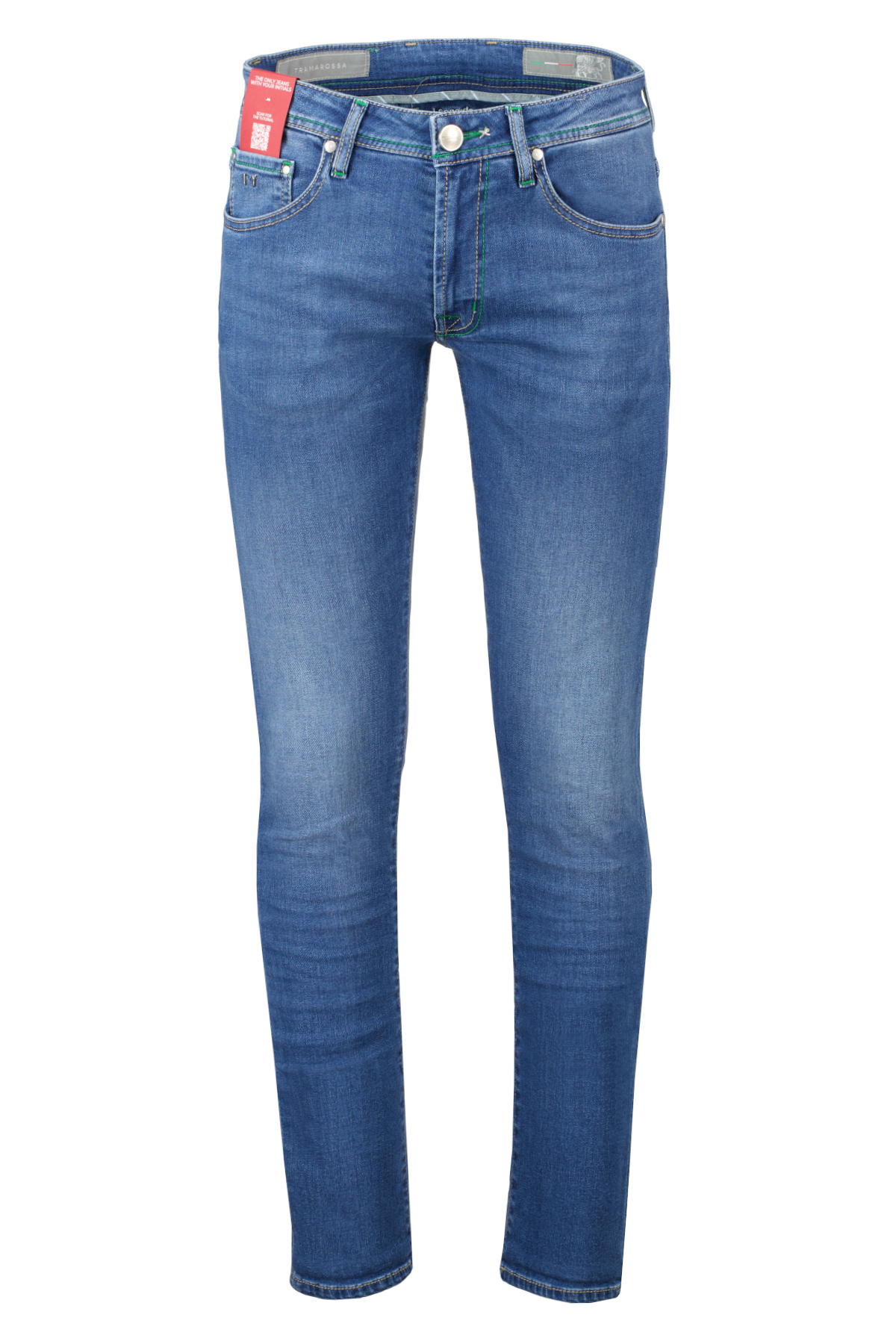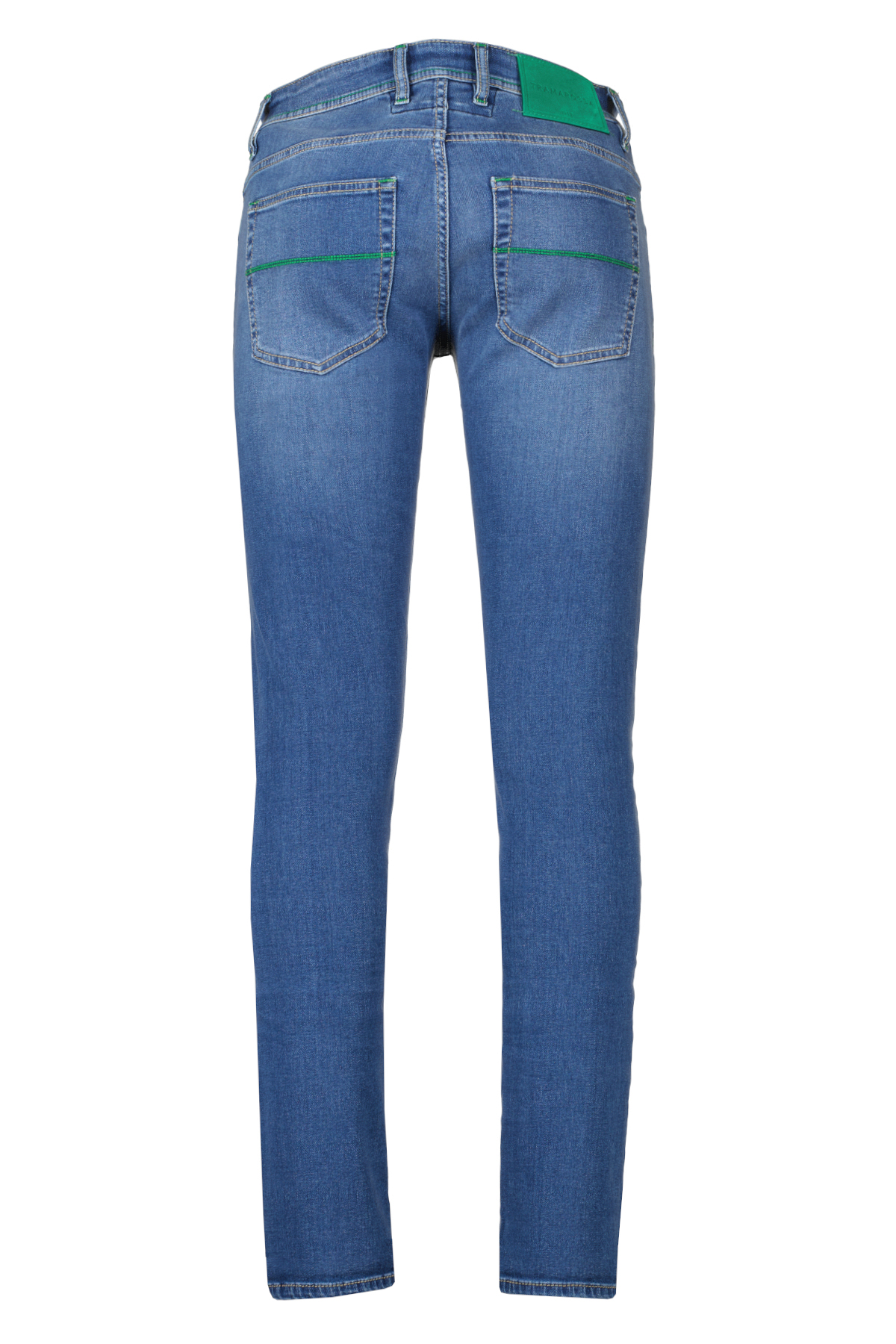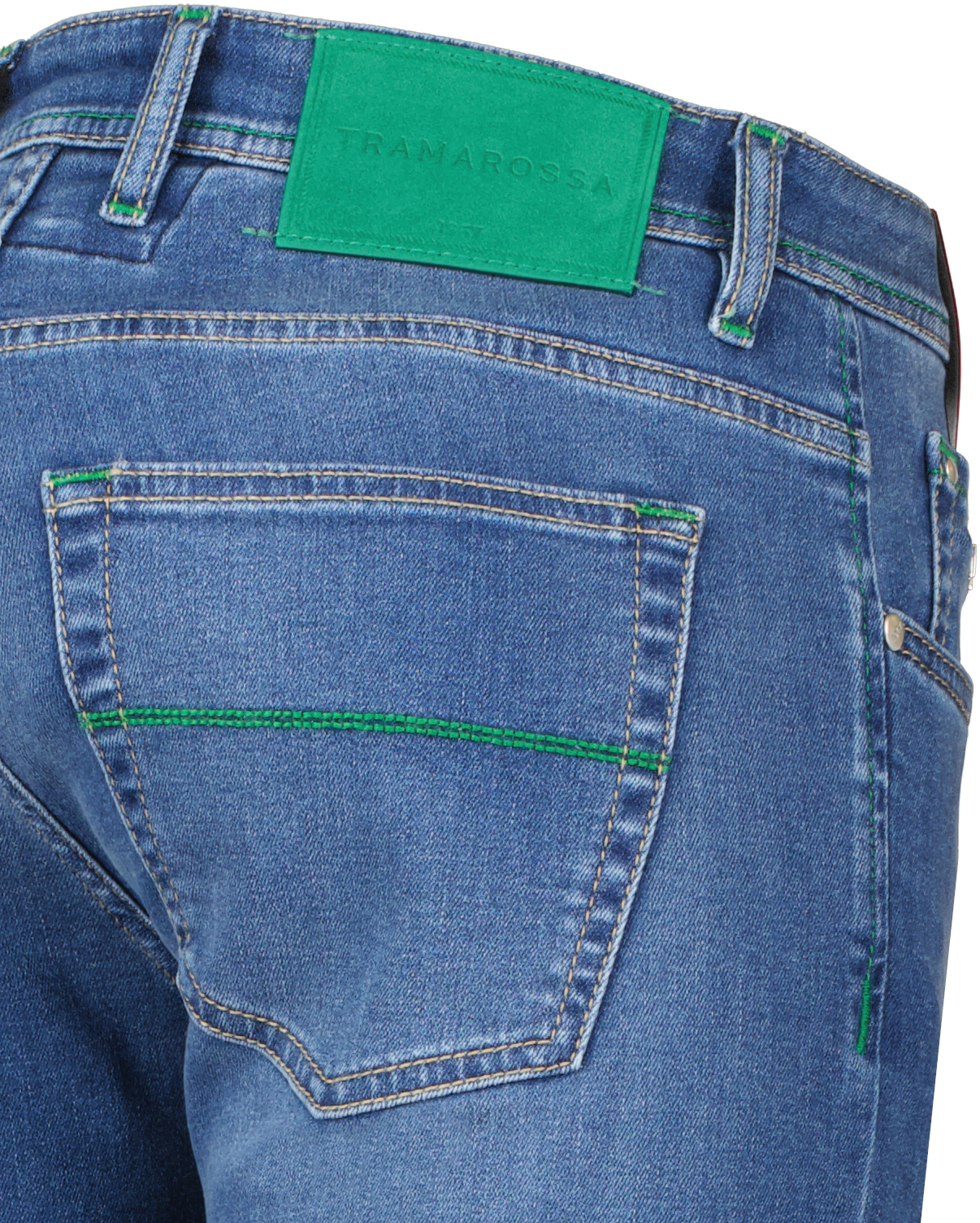 Blauwe heren jeans met groene stiksels van Tramarossa in model Leonardo. De Leonardo valt slim met minimale stretch, en minimaliseert de structuur van de stof de vorming van kreukels. De wassing heeft een 6 months heritage. Verder heeft de jeans een 5 pocket afwerking met ritssluiting. De jeans kunnen worden voorzien van je initialen d.m.v. kleine, metalen letters. Vraag hiernaar in onze winkels.