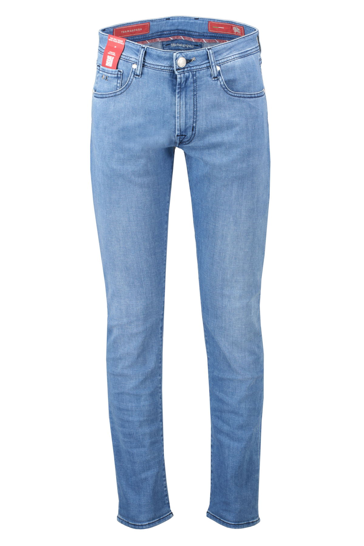 Blauwe jeans voor heren model Michelangelo van Tramarossa. De Michelangelo is een broek met vijf zakken en een normale, slanke pasvorm, soepel rond de benen en de zoom, met behoud van een flatterend silhouet. Heeft een gebogen knoopsluiting, gebogen oppervlak met glanzende metallic print, label op de achterkant van Tramarossa-leer, gepersonaliseerd met een logo in reliëf.