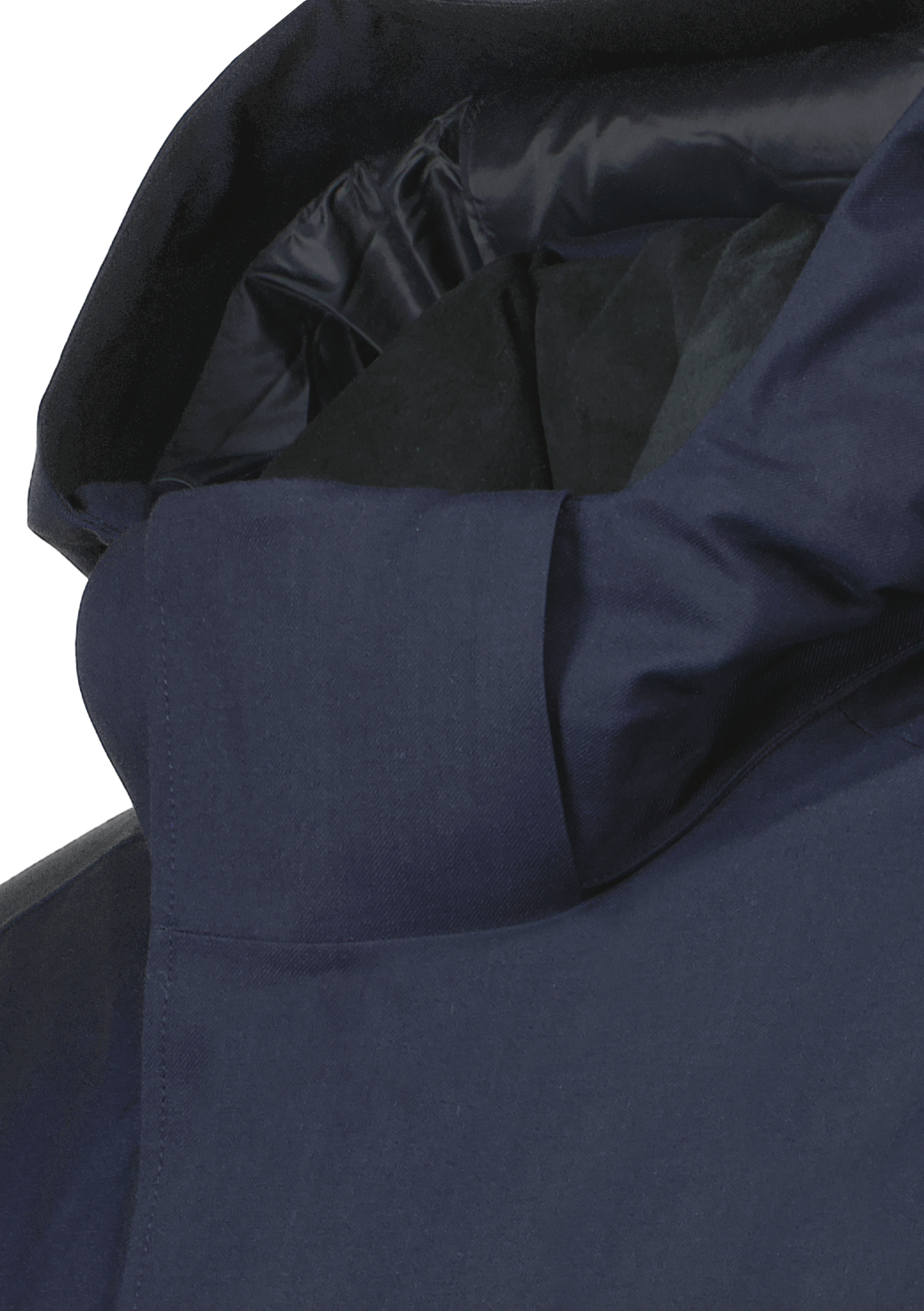 Donkerblauwe jas voor heren model Regulator Savile van UBR. De Savile is gemaakt met merinowol vulling, gewoven in Italië. De jas heeft een op maat gemaakte pasvorm, heeft een tweeweg rits, gelamineerde voorsluiting, twee zijzakken, binnenzak met ritssluiting, capuchon en valt getailleerd.