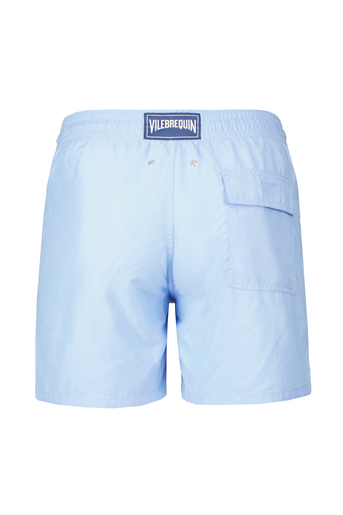 Lichtblauwe zwemshort van Vilebrequin. Model Moorea effen zwemshort voor heren is een absolute klassieker. Gemakkelijk herkenbaar aan de originele snit uit de jaren 70 met drie zakken, ze zijn stijlvol met veel gevoel voor detail. Deze tijdloze zwemshort is net zo stijlvol in het water als op het land. De zwemshort heeft een elastische tailleband en trekkoord met Zamac uiteinden, twee zijzakken en een achterzak met klittenbandsluiting. Twee oogjes aan de achterkant laten water weglopen en verminderen het "ballon"-effect wanneer je uit het water komt. De stof is behandeld voor een sneldrogend effect.