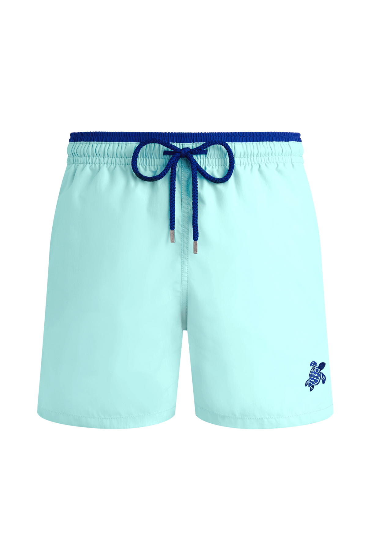 Turquoise zwemshort voor heren van Vilebrequin. Deze tweekleurige zwemshort met een contrasterende kleur aan de binnenkant van de band en 15 cm aan de buitenkant heeft een elastische tailleband en trekkoord met zamak-tips, twee steekzakken, een achterzak met klittenbandsluiting en twee oogjes aan de achterkant. Er is een contrasterende schildpad geborduurd op de onderkant van het linkerbeen.
