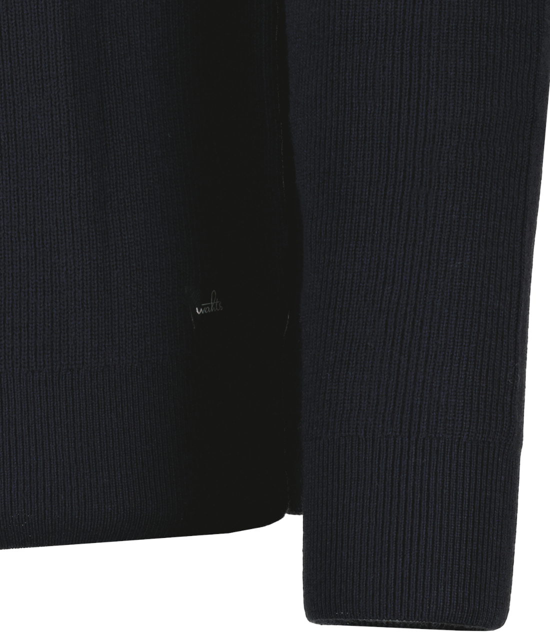 Donkerblauwe trui voor heren model Hodge van Wahts. De Hodge is gemaakt van extrafijne merinowol voor zachtheid en natuurlijk ademend vermogen, van middelzware geribbelde breisel. De rits heeft een gunmetal kleur en de kraag, manchetten en zoom zijn geribbeld.
