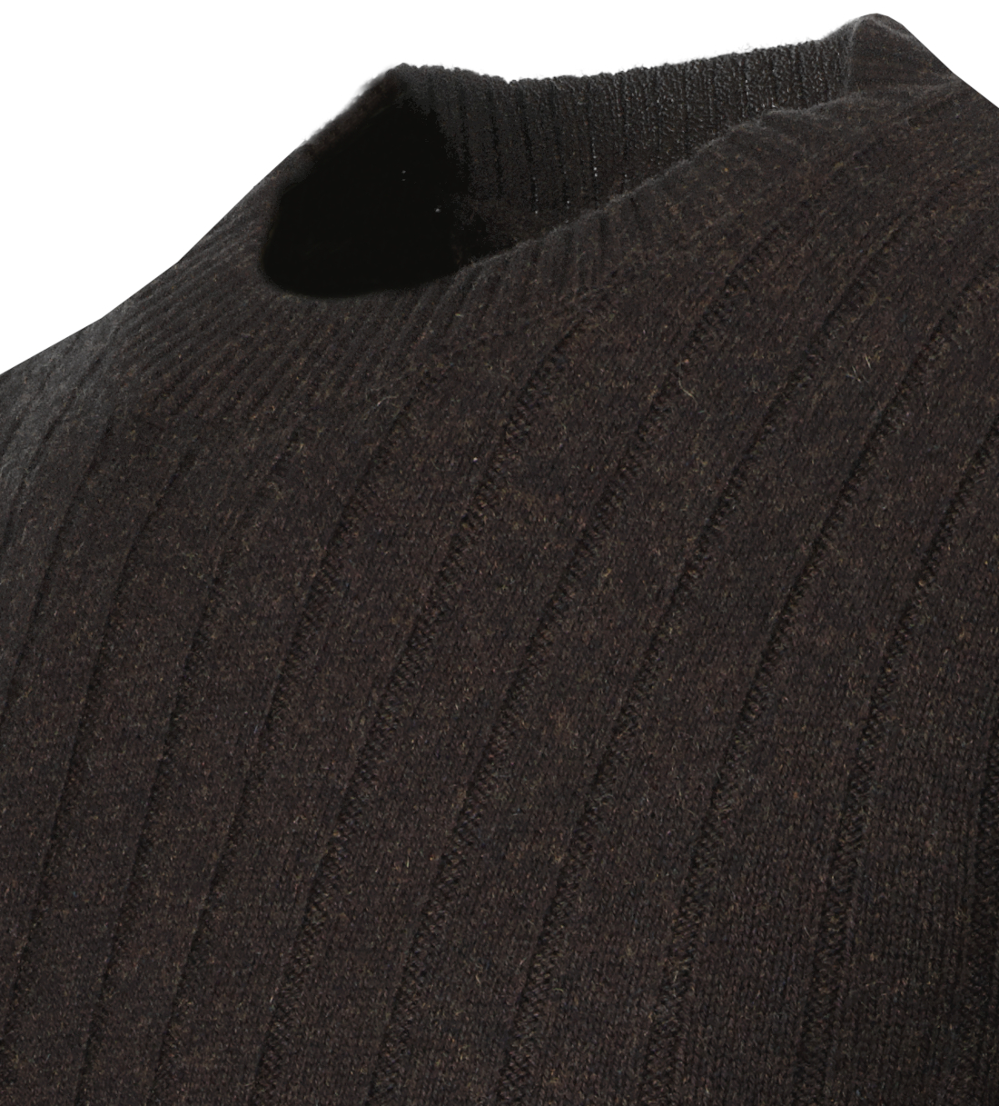Donkerbruine trui voor heren model Nilson van Wahts. De Nilsen is gebreid van een luxueuze mix van merinowol en kasjmier, die uitzonderlijke zachtheid, warmte en ademend vermogen biedt. Afgewerkt met een 2x2 geribde kraag, manchetten en zoom, en heeft een regular fit.