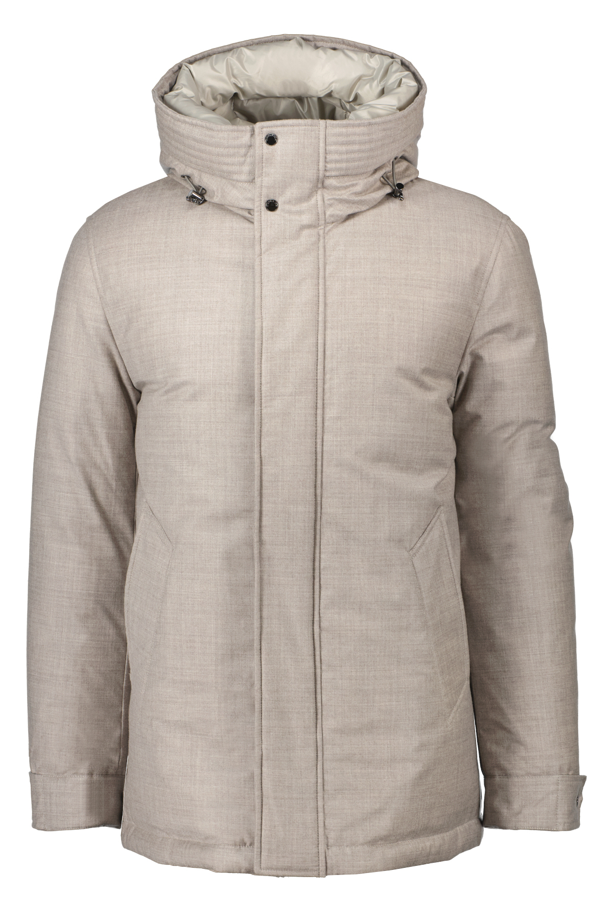 Beige jas voor heren model LP Wool Short Parka van Woolrich. Deze parka is gemaakt van een luxe mix van zuivere scheerwol en zijde van Loro Piana, windbestendig en gevoerd met dons voor warmte zonder extra volume. De Storm System®-behandeling creëert een beschermend membraan tegen regen, vuil en vlekken. De jas heeft daarnaast een verstelbare capuchon met trekkoord, verstelbare manchetten, paspelzakken, een binnenzak met verticale rits, een verborgen tweerichtingsrits en drukknopen, met twee zichtbare knopen aan de bovenkant en een metalen logoplaatje op de capuchon.