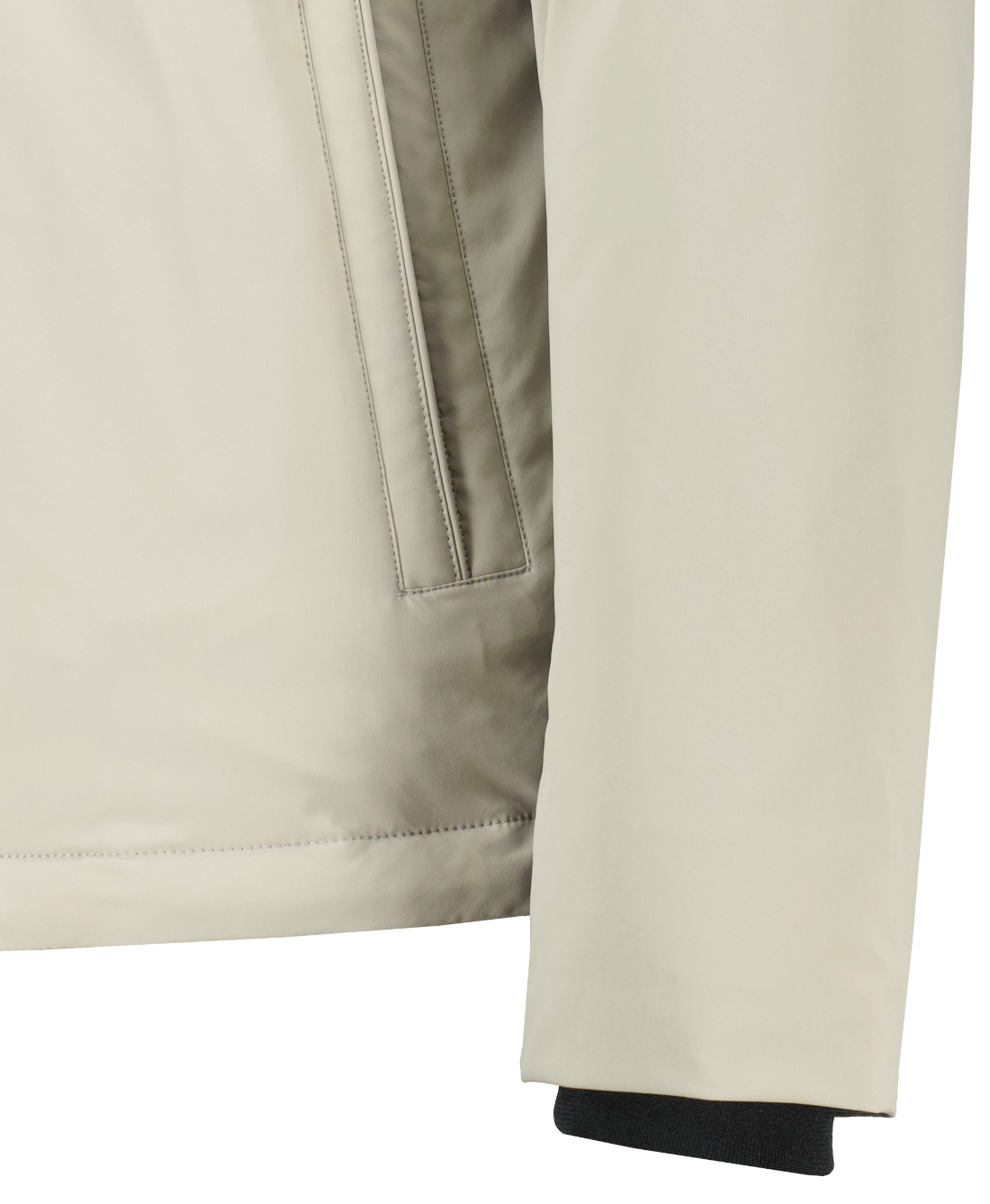 Grijsbeige jas voor heren model Stretch Jacket van Woolrich. Het jack is gemaakt van elastisch nylon, een water- en winddichte stof die tegen weersinvloeden beschermt, en gevuld met eendendons, ideaal voor wanneer de temperaturen dalen. Met afneembare en verstelbare capuchon, hoge kraag, intern zoomtrekkoord en geribde binnenmanchetten, elementen die een model warm en veelzijdig maken. Het jack heeft een tweezijdige verborgen rits met een rij handige, verborgen drukknopen. Een reeks zakken maakt het jack compleet: twee paspelzakken met rits en drie binnenzakken, twee elastische en één met rits.