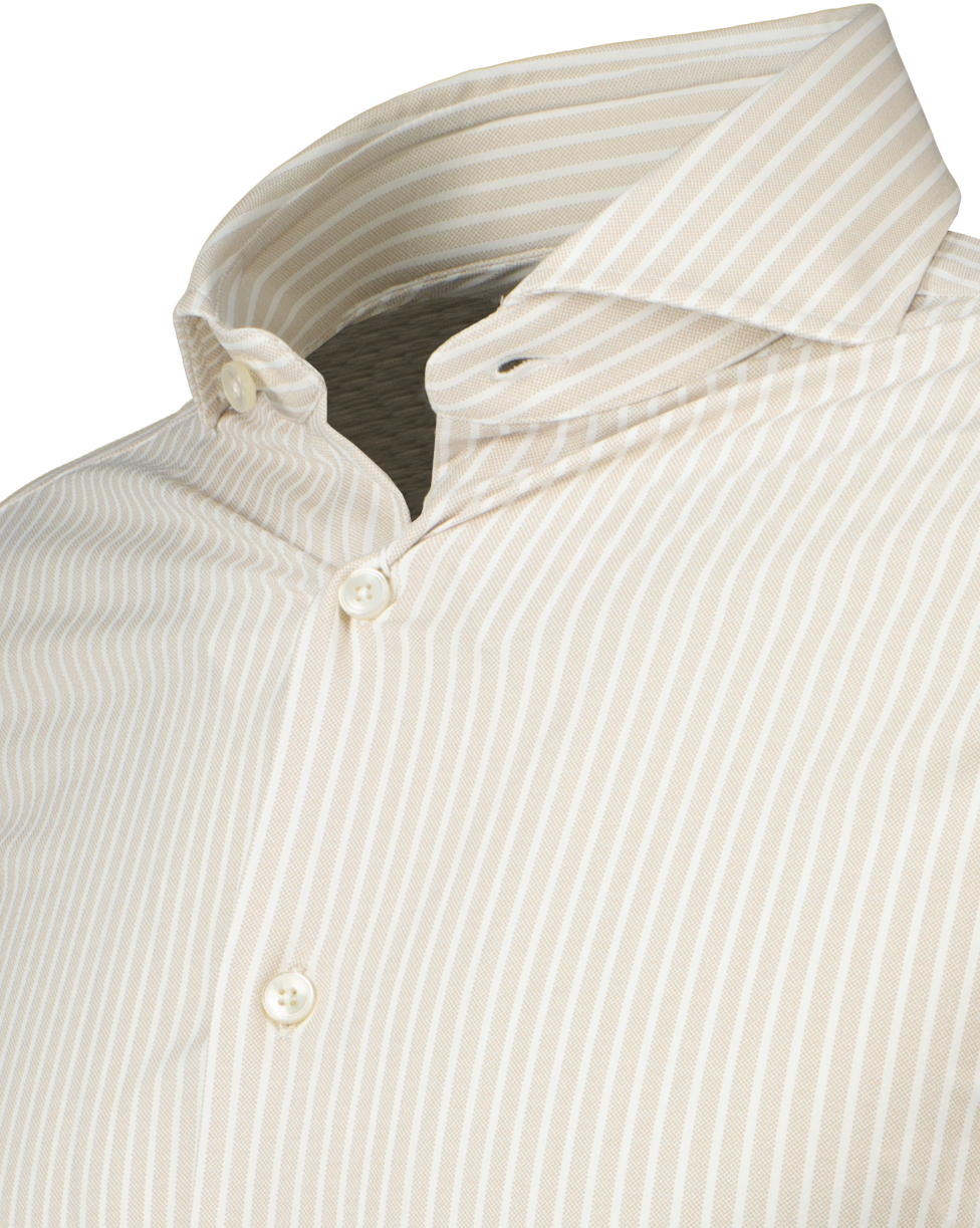 Beige gestreept overhemd voor heren van Xacus. De Active shirts van Xacus zijn gemaakt met exclusieve Japanse technologie, van nylon- en elastaangaren met flaneleffect en is een zeer ademend, 3D-stretchstuk dat snel droogt en comfortabel blijft in elke bewegingssituatie. Het combineert de elegantie van een formeel overhemd met een perfecte stijl, zonder concessies te doen aan de maximale functionaliteit.
