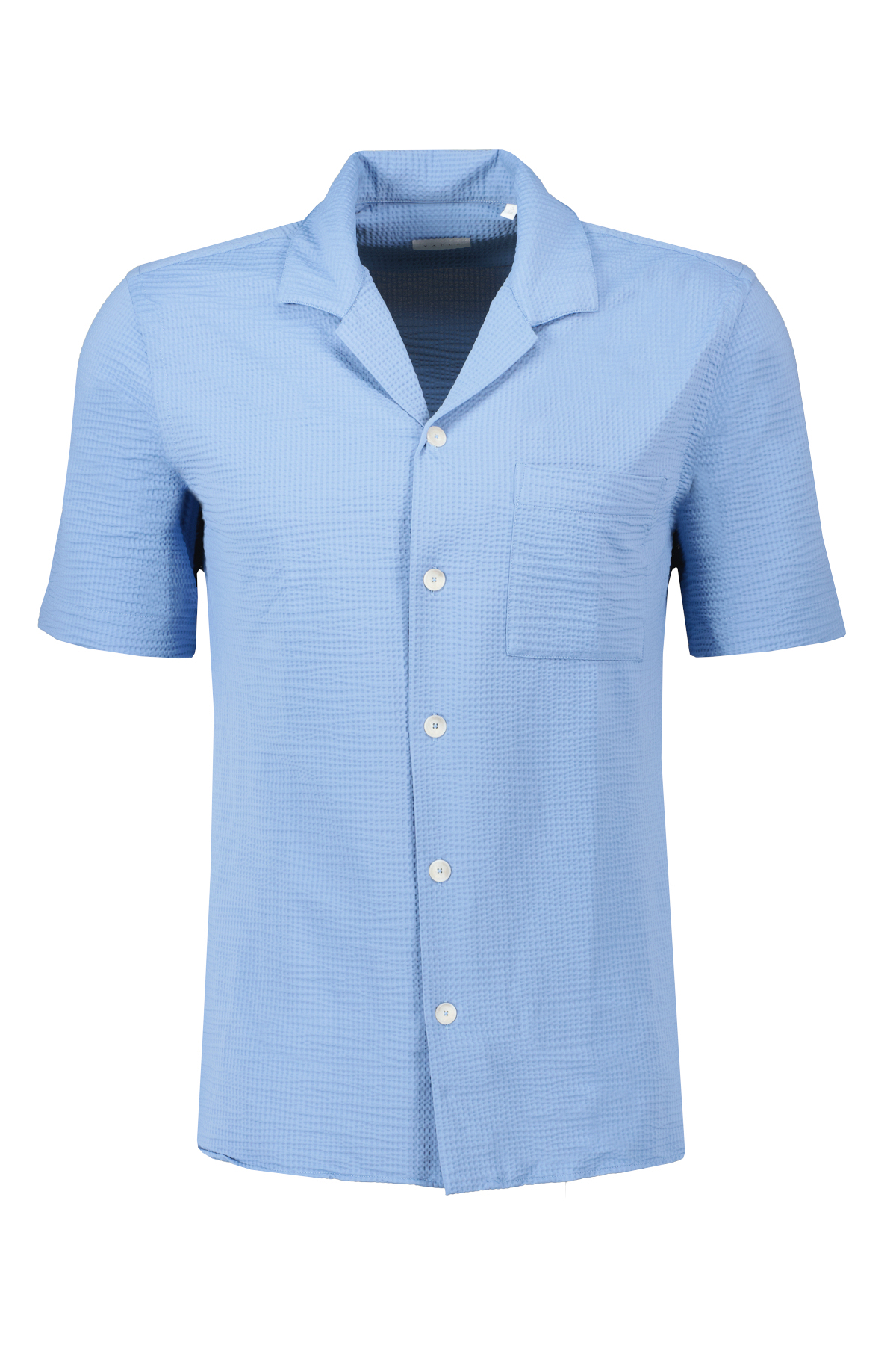 Blauw overhemd voor heren van Xacus. Dit overhemd heeft korte mouwen, is gemaakt van een seersucker stof en is gemaakt met exclusieve Japanse technologie, van nylon- en elastaangaren met flaneleffect en is een zeer ademend, 3D-stretchstuk dat snel droogt en comfortabel blijft in elke bewegingssituatie. Het combineert de elegantie van een formeel overhemd met een perfecte stijl, zonder concessies te doen aan de maximale functionaliteit.