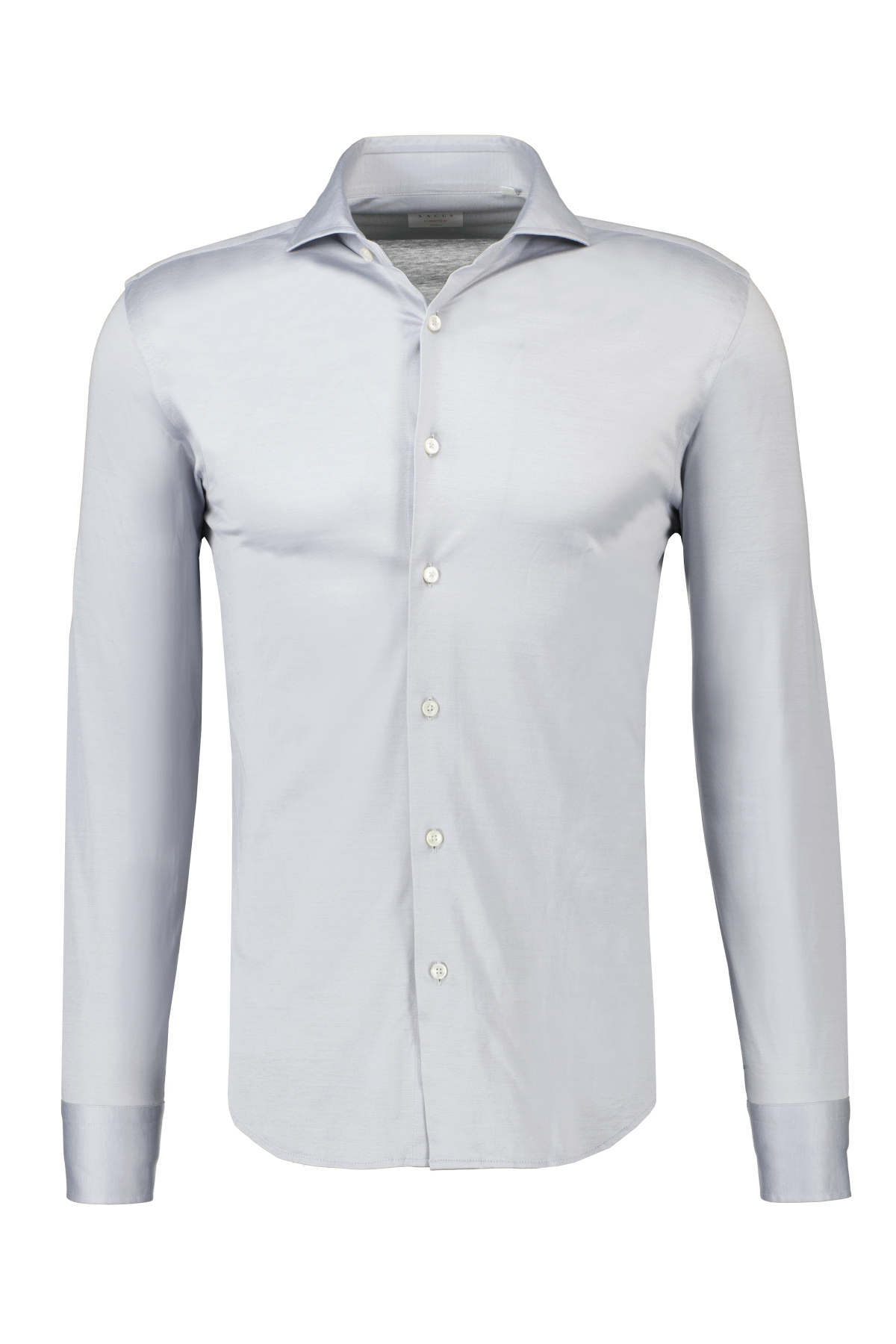 Grijs overhemd 'Knitted Shirt' voor heren van Xacus. De Knitted Shirts zijn, in tegenstelling tot andere stoffen, op een weefgetouw met inslag en ketting geweven. De Jersey is eigenlijk een tricotsteekstof, verkregen uit elke textielvezel, waarvan katoen, wol en viscose de meest voorkomende zijn. Dit proces zorgt voor een bijzonder lichte, elastische en zachte stof, waardoor het ideaal is voor het maken van herenoverhemden met een uitzonderlijk goede pasvorm die met het lichaam meebeweegt voor maximaal comfort.