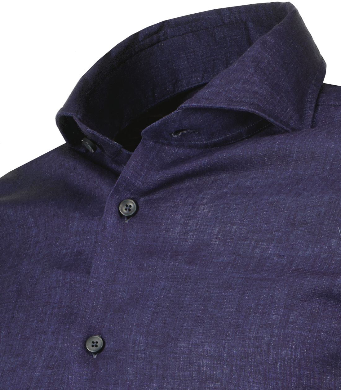 Donkerblauw linnen overhemd voor heren van Xacus. Casual, garment-washed overhemd voor een sportieve, casual look. De cutaway kraag en ronde manchetten zijn zachter en minder geconstrueerd. Door de linnen stof is het overhemd ademend, geeft thermisch comfort en heeft stevige garen.